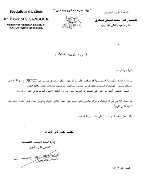 - IMATEC partnered with Mediso (Hungary), introducing their nuclear medicine product line to the Syrian market.
