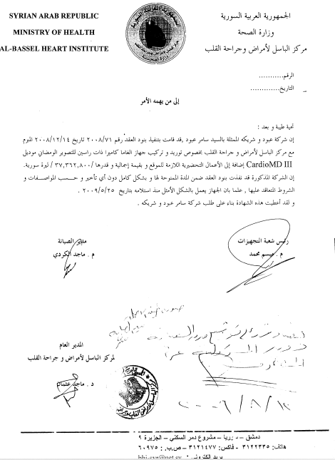 2009- Ministry of Health - Al Bassel Heart Institute